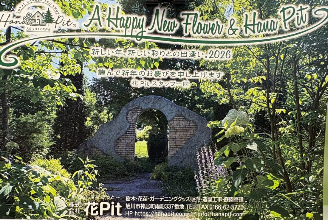 花PIT年賀状です ブログ 2026年1月20日 遅ればせながら2026バージョンの年賀状🎍緑いっぱいで私好み😍新しいロゴも載せていい感じに仕上がりました✌️…早くこんな時期が来ないかな…と、これから冬本番なのに思う日々です笑